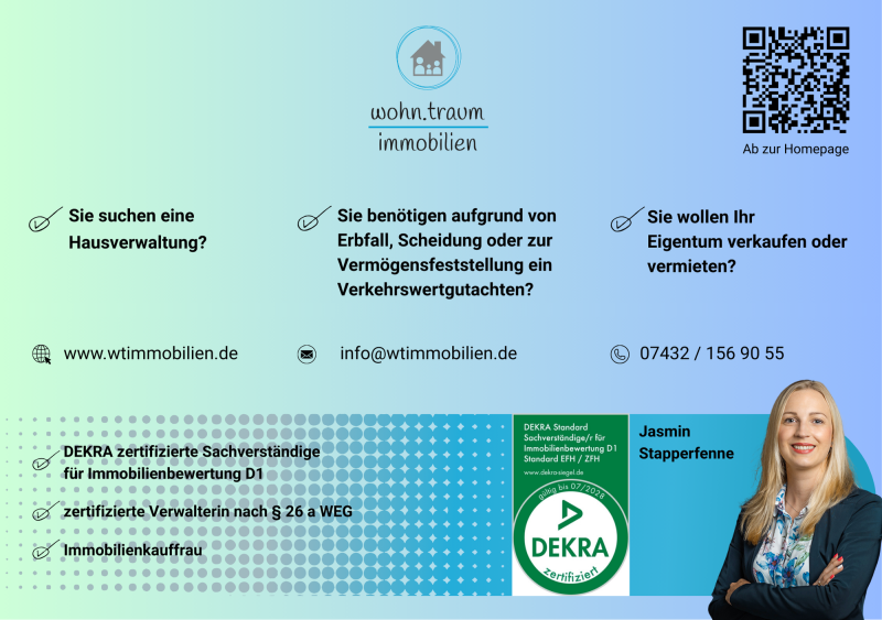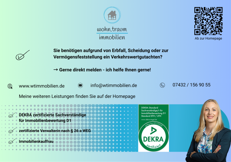 Als DEKRA zertifizierte Sachverständige für Immobilienbewertung D1 EFH/ZFH unterstütze ich Sie gerne bei der Erstellung von Gutachten für Ihre Immobilie zur Wertermittlung - sei es in einer Erbsache, wegen Scheidung oder zur Vermögensübersicht.